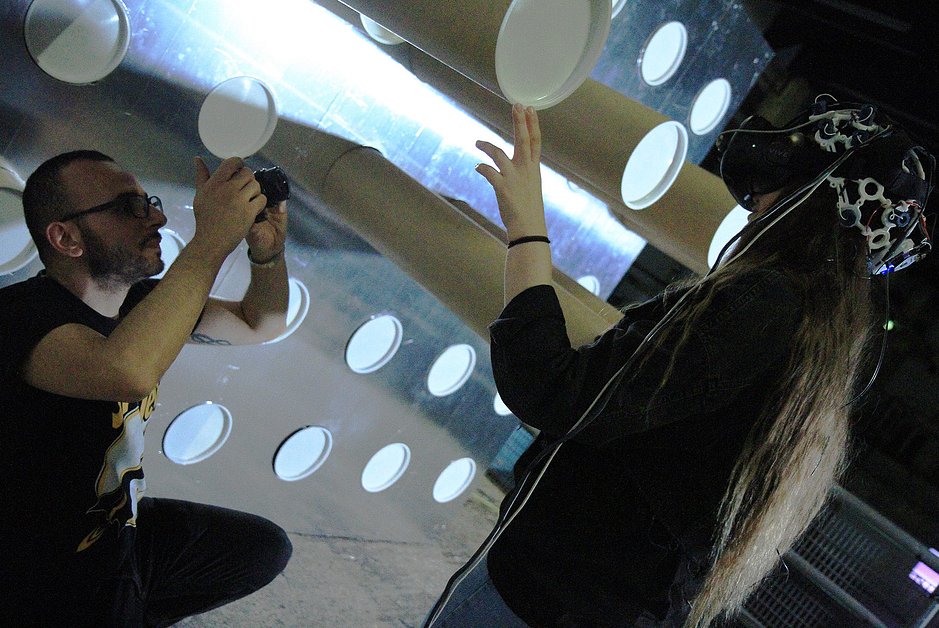Dancing on the mezzanine in a cross-reality zone of virtual, physical, and mental spaces – Anti-Gravity Reality: Inside the Black Cube or Brain AI looks freely towards vast open spaces of an unfolding concrete chamber mimicking its appearance through inclusion of windows in its structure. While windows observe the slow movement of the tubes and turned into a performer participant who is, immersed in VR, unaware of this surveillance mechanism.