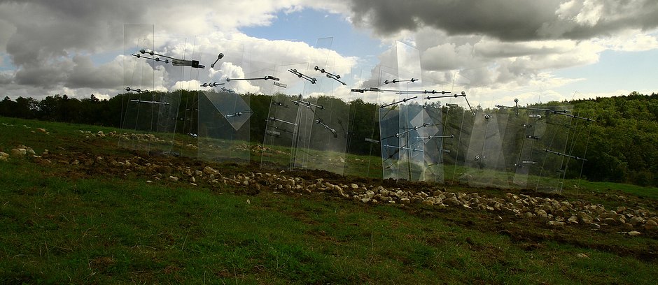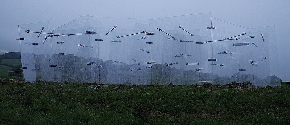 The viewer is reminded about filmic renditions of haunted houses as much as of the former hospital's miserable procedures and also, vis the work's fuzzy blue shimmer and arched windows, of a Byzantine church.